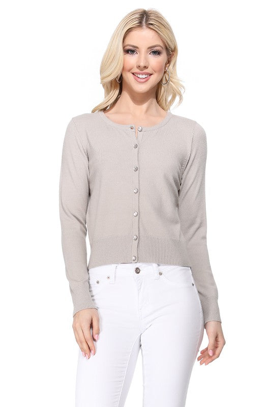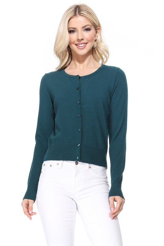 - 18"-19" Length, Crewneck, Long Sleeves, Rounded Jewel Buttons, Button Down, Basic and Classic Viscose Crop Cardigan Sweater for Women.